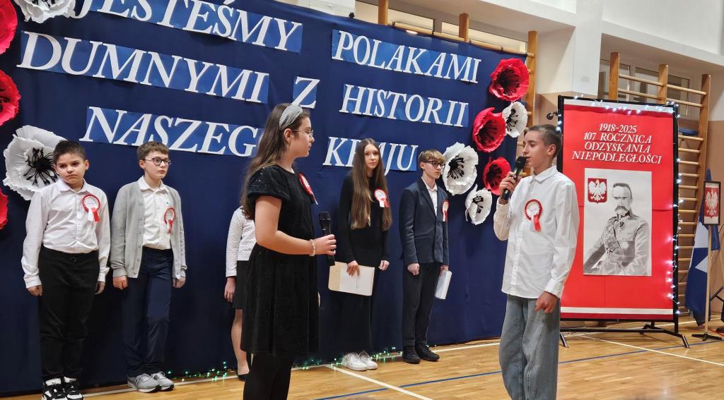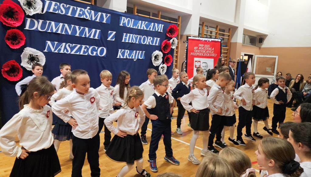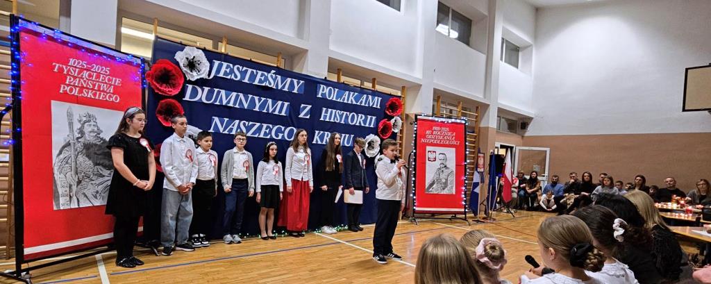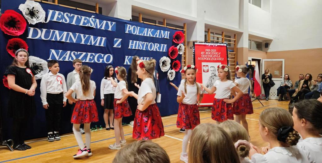 Na scenie zabrzmiały tradycyjne dla tej okazji utwory muzyczne: „Piechota”, „Rota”, „O mój rozmarynie…”, „Przybyli ułani pod okienko” i inne. Wykonawcami byli: Amelia Micał, Gabriela Bodzenta, Amelia Leśniak (→) i Filip Gliwa (→) oraz chór złożony z osób z klas czwartych i siódmych. Wiersze recytowali Gabriela Bodzenta, Natalia Płocica, Lena Mosiak, Julian Polak (→), Maksym Lukashchuk, Filip Woźny, i Jan Pruc (→). Wysłuchaliśmy także utworu na fortepian Fryderyka Chopina w interpretacji Franciszka Ustrobińskiego (→). Godnym uwagi było odśpiewanie przez uczniów i uczennice z klasy 4c piosenki legionowej, czemu towarzyszył pokaz tekstu w języku migowym zaprezentowany pod kierunkiem Pana Michała Kłopota, specjalisty – surdopedagoga (→). Jak zawsze, pełne wyjątkowego wdzięku i uroku były występy najmłodszych: „lekcja” tańców polskich przedstawiona przez dzieci z klasy 1c (→) pod opieką Pani Eweliny Łojewskiej oraz polka w wykonaniu dziewczynek z klasy 3c (→) przygotowanych przez Panią Elżbietę Stanisławczyk. Podczas imprezy wystąpiły także laureatki Szkolnego Konkursu Piosenki Patriotycznej – Klara Gładyś z kl. 7c oraz Patrycja Kuczmenda z kl. 3c.