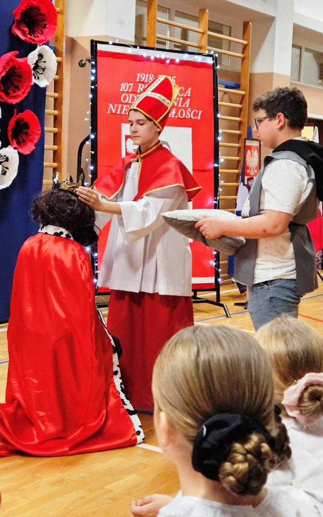 Inscenizacja koronacji pierwszego króla Polski z roku 1025, w wykonaniu Filipa Kurcka z kl. 8b w roli Bolesława Chrobrego oraz Kamila Krząstka z kl. 7b w roli arcybiskupa Hipolita (→), przypomniała nam wielką wagę aktu, który dał początek historii naszej państwowości. W ten sposób uczciliśmy również doniosłą rocznicę, jaką świętujemy w 2025 roku: 1000-lecie państwa polskiego.