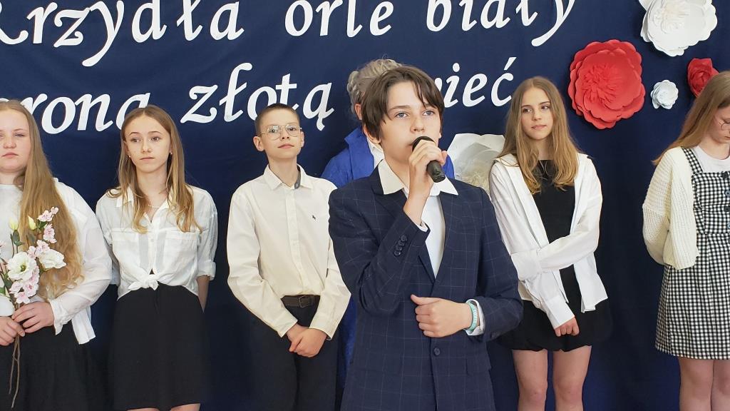 Na scenie zabrzmiały tradycyjne dla tej okazji utwory muzyczne: „Piechota”, „Rota”, „O mój rozmarynie…”, „Przybyli ułani pod okienko” i inne. Wykonawcami byli: Amelia Micał, Gabriela Bodzenta, Amelia Leśniak (→) i Filip Gliwa (→) oraz chór złożony z osób z klas czwartych i siódmych. Wiersze recytowali Gabriela Bodzenta, Natalia Płocica, Lena Mosiak, Julian Polak (→), Maksym Lukashchuk, Filip Woźny, i Jan Pruc (→). Wysłuchaliśmy także utworu na fortepian Fryderyka Chopina w interpretacji Franciszka Ustrobińskiego (→). Godnym uwagi było odśpiewanie przez uczniów i uczennice z klasy 4c piosenki legionowej, czemu towarzyszył pokaz tekstu w języku migowym zaprezentowany pod kierunkiem Pana Michała Kłopota, specjalisty – surdopedagoga (→). Jak zawsze, pełne wyjątkowego wdzięku i uroku były występy najmłodszych: „lekcja” tańców polskich przedstawiona przez dzieci z klasy 1c (→) pod opieką Pani Eweliny Łojewskiej oraz polka w wykonaniu dziewczynek z klasy 3c (→) przygotowanych przez Panią Elżbietę Stanisławczyk. Podczas imprezy wystąpiły także laureatki Szkolnego Konkursu Piosenki Patriotycznej – Klara Gładyś z kl. 7c oraz Patrycja Kuczmenda z kl. 3c.