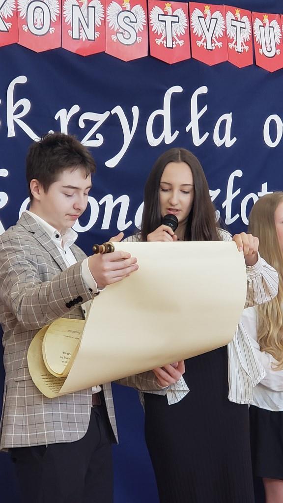 Inscenizacja koronacji pierwszego króla Polski z roku 1025, w wykonaniu Filipa Kurcka z kl. 8b w roli Bolesława Chrobrego oraz Kamila Krząstka z kl. 7b w roli arcybiskupa Hipolita (→), przypomniała nam wielką wagę aktu, który dał początek historii naszej państwowości. W ten sposób uczciliśmy również doniosłą rocznicę, jaką świętujemy w 2025 roku: 1000-lecie państwa polskiego.