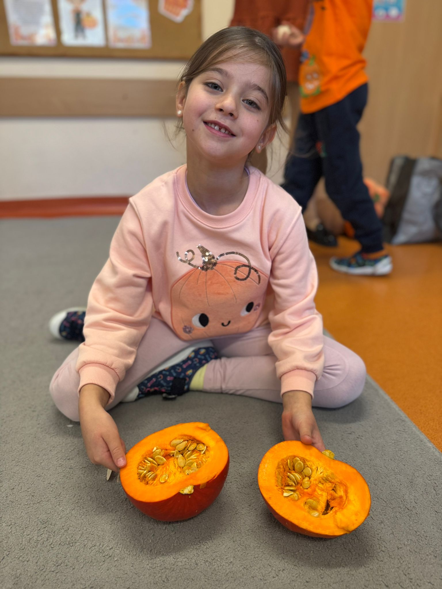 Podczas Dnia Dyni w sali królował kolor pomarańczowy. Dzieci brały udział w zabawach tematycznych i wykonały pracę plastyczną związaną z jesiennym warzywem (→foto., →foto., →foto.).