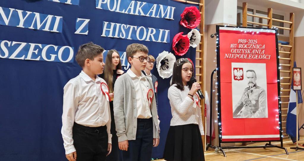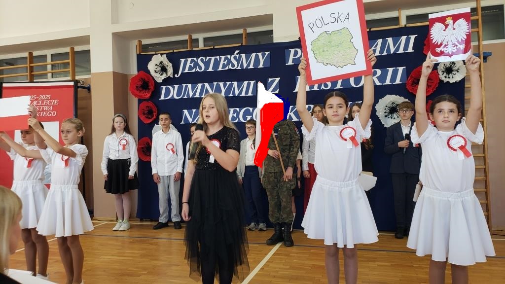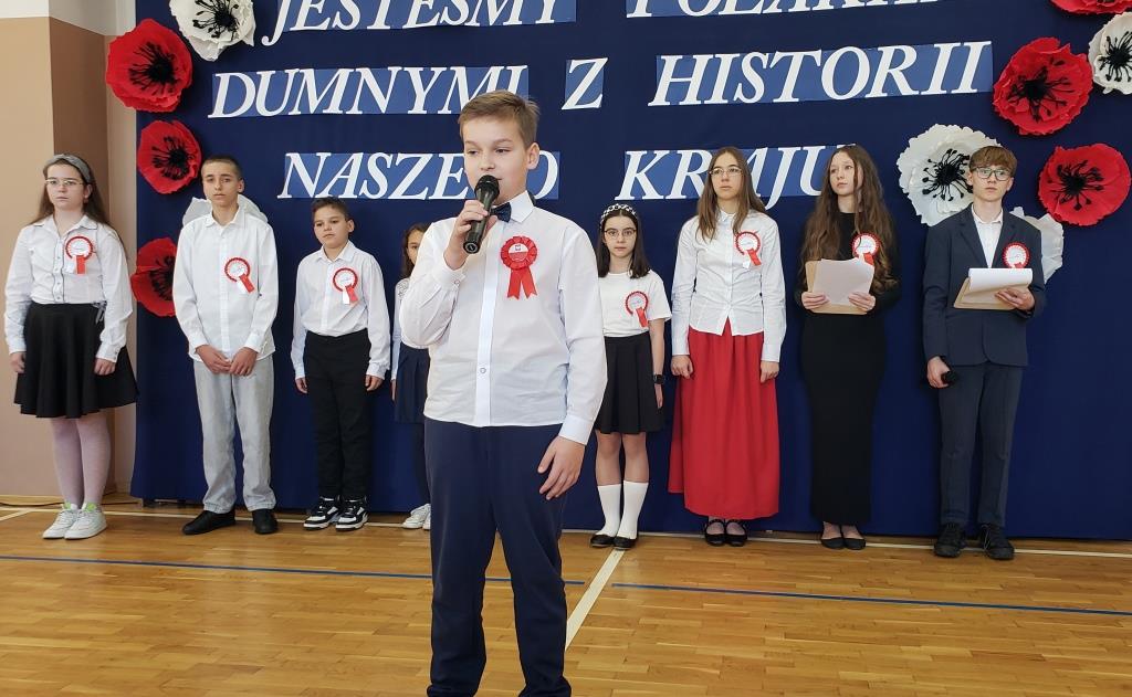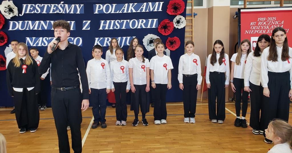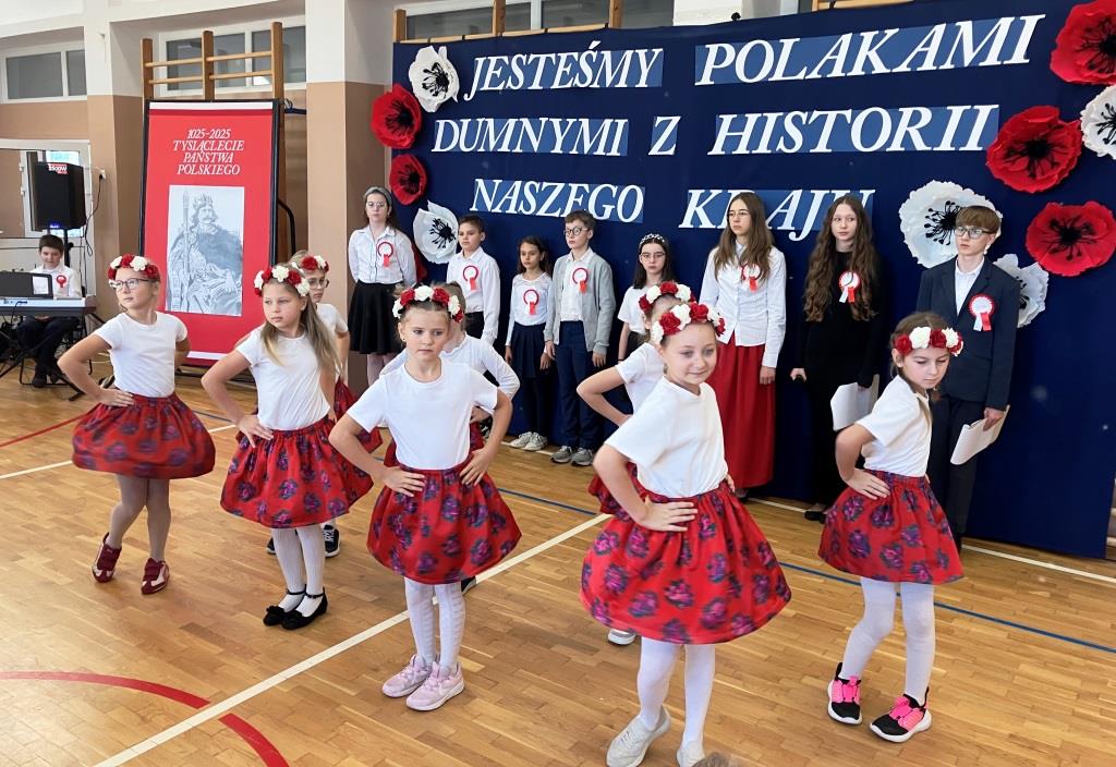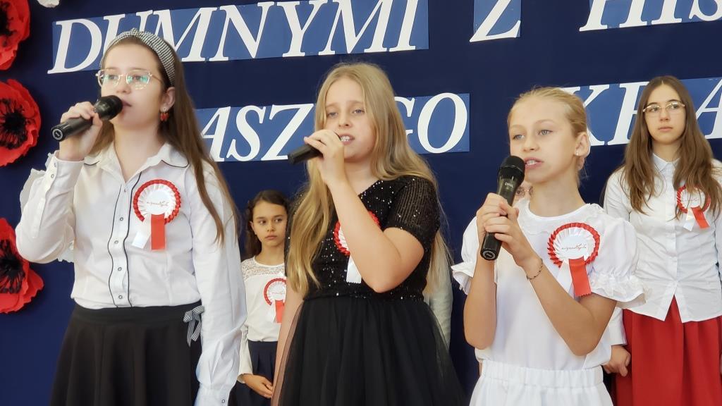 Na scenie zabrzmiały tradycyjne dla tej okazji utwory muzyczne: „Piechota”, „Rota”, „O mój rozmarynie…”, „Przybyli ułani pod okienko” i inne. Wykonawcami byli: Amelia Micał, Gabriela Bodzenta, Amelia Leśniak (→) i Filip Gliwa (→) oraz chór złożony z osób z klas czwartych i siódmych. Wiersze recytowali Gabriela Bodzenta, Natalia Płocica, Lena Mosiak, Julian Polak (→), Maksym Lukashchuk, Filip Woźny, i Jan Pruc (→). Wysłuchaliśmy także utworu na fortepian Fryderyka Chopina w interpretacji Franciszka Ustrobińskiego (→). Godnym uwagi było odśpiewanie przez uczniów i uczennice z klasy 4c piosenki legionowej, czemu towarzyszył pokaz tekstu w języku migowym zaprezentowany pod kierunkiem Pana Michała Kłopota, specjalisty – surdopedagoga (→). Jak zawsze, pełne wyjątkowego wdzięku i uroku były występy najmłodszych: „lekcja” tańców polskich przedstawiona przez dzieci z klasy 1c (→) pod opieką Pani Eweliny Łojewskiej oraz polka w wykonaniu dziewczynek z klasy 3c (→) przygotowanych przez Panią Elżbietę Stanisławczyk. Podczas imprezy wystąpiły także laureatki Szkolnego Konkursu Piosenki Patriotycznej – Klara Gładyś z kl. 7c oraz Patrycja Kuczmenda z kl. 3c.