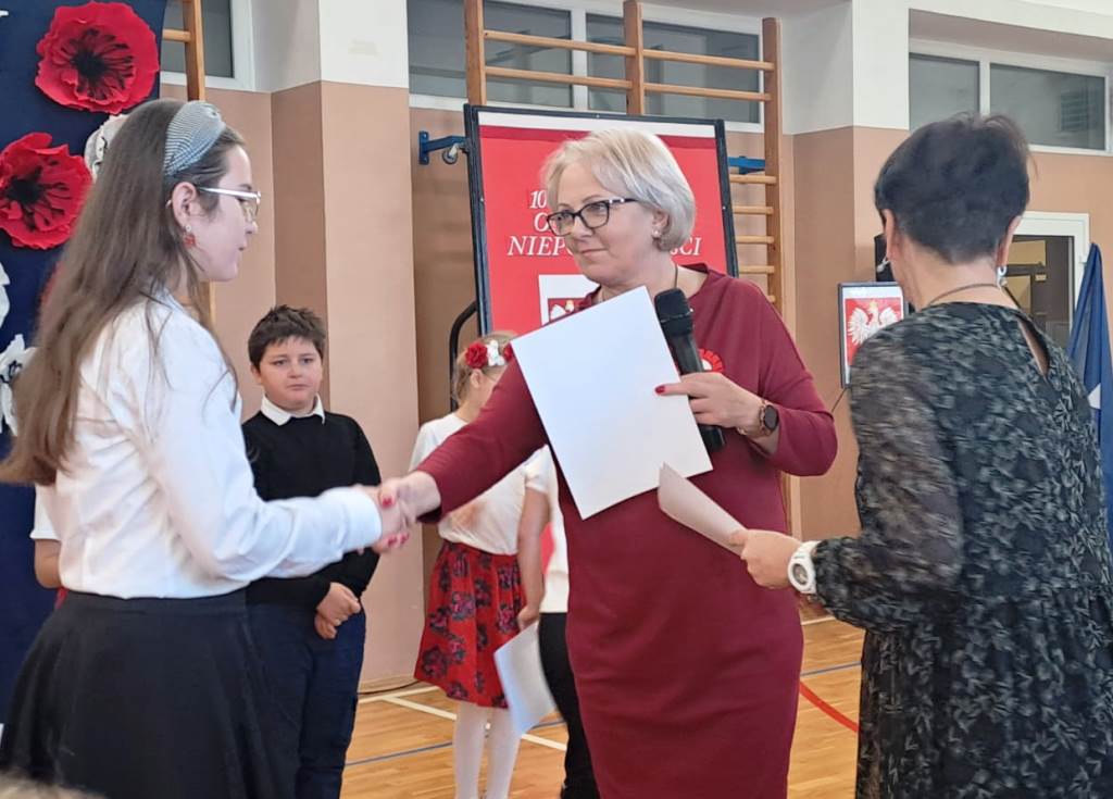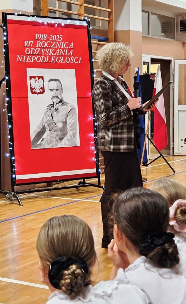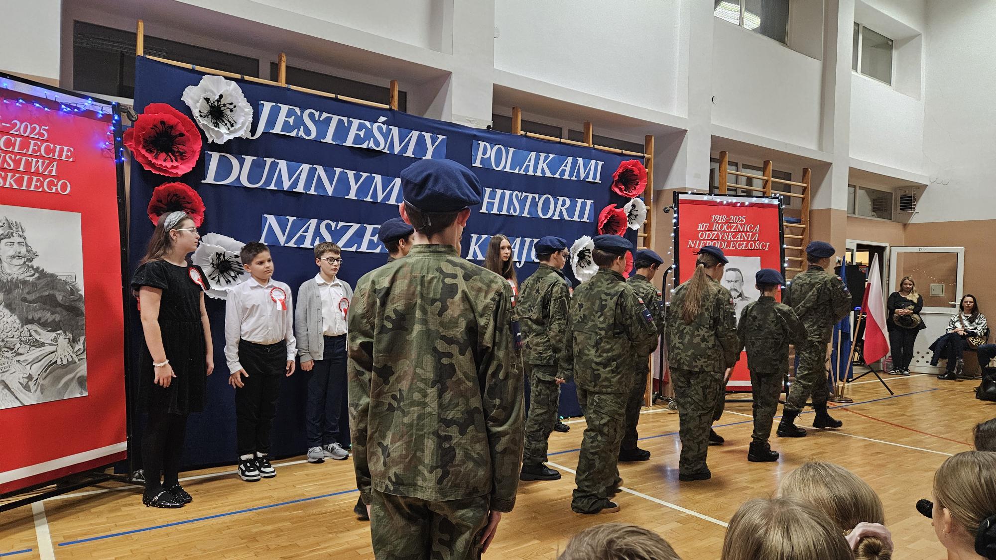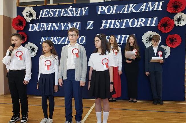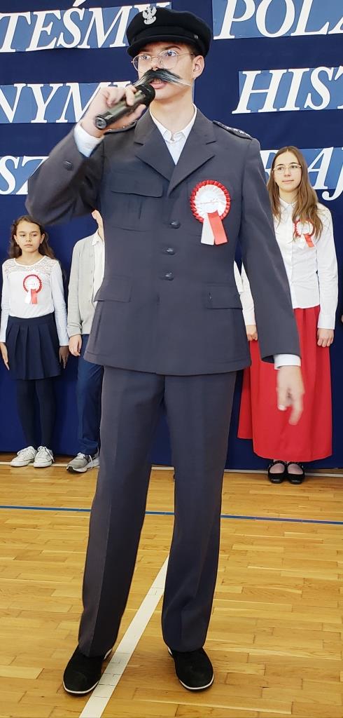 Na scenie zabrzmiały tradycyjne dla tej okazji utwory muzyczne: „Piechota”, „Rota”, „O mój rozmarynie…”, „Przybyli ułani pod okienko” i inne. Wykonawcami byli: Amelia Micał, Gabriela Bodzenta, Amelia Leśniak (→) i Filip Gliwa (→) oraz chór złożony z osób z klas czwartych i siódmych. Wiersze recytowali Gabriela Bodzenta, Natalia Płocica, Lena Mosiak, Julian Polak (→), Maksym Lukashchuk, Filip Woźny, i Jan Pruc (→). Wysłuchaliśmy także utworu na fortepian Fryderyka Chopina w interpretacji Franciszka Ustrobińskiego (→). Godnym uwagi było odśpiewanie przez uczniów i uczennice z klasy 4c piosenki legionowej, czemu towarzyszył pokaz tekstu w języku migowym zaprezentowany pod kierunkiem Pana Michała Kłopota, specjalisty – surdopedagoga (→). Jak zawsze, pełne wyjątkowego wdzięku i uroku były występy najmłodszych: „lekcja” tańców polskich przedstawiona przez dzieci z klasy 1c (→) pod opieką Pani Eweliny Łojewskiej oraz polka w wykonaniu dziewczynek z klasy 3c (→) przygotowanych przez Panią Elżbietę Stanisławczyk. Podczas imprezy wystąpiły także laureatki Szkolnego Konkursu Piosenki Patriotycznej – Klara Gładyś z kl. 7c oraz Patrycja Kuczmenda z kl. 3c.
