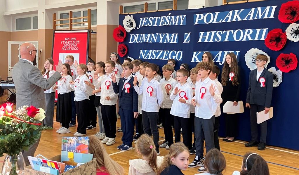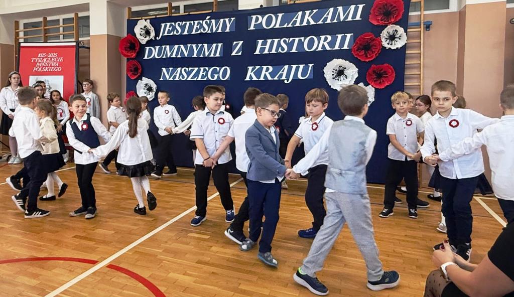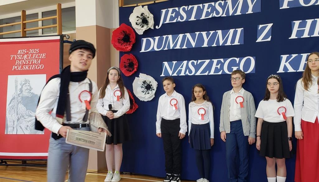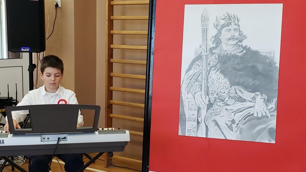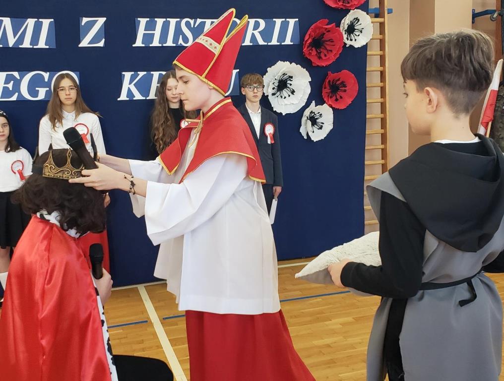 Inscenizacja koronacji pierwszego króla Polski z roku 1025, w wykonaniu Filipa Kurcka z kl. 8b w roli Bolesława Chrobrego oraz Kamila Krząstka z kl. 7b w roli arcybiskupa Hipolita (→), przypomniała nam wielką wagę aktu, który dał początek historii naszej państwowości. W ten sposób uczciliśmy również doniosłą rocznicę, jaką świętujemy w 2025 roku: 1000-lecie państwa polskiego.