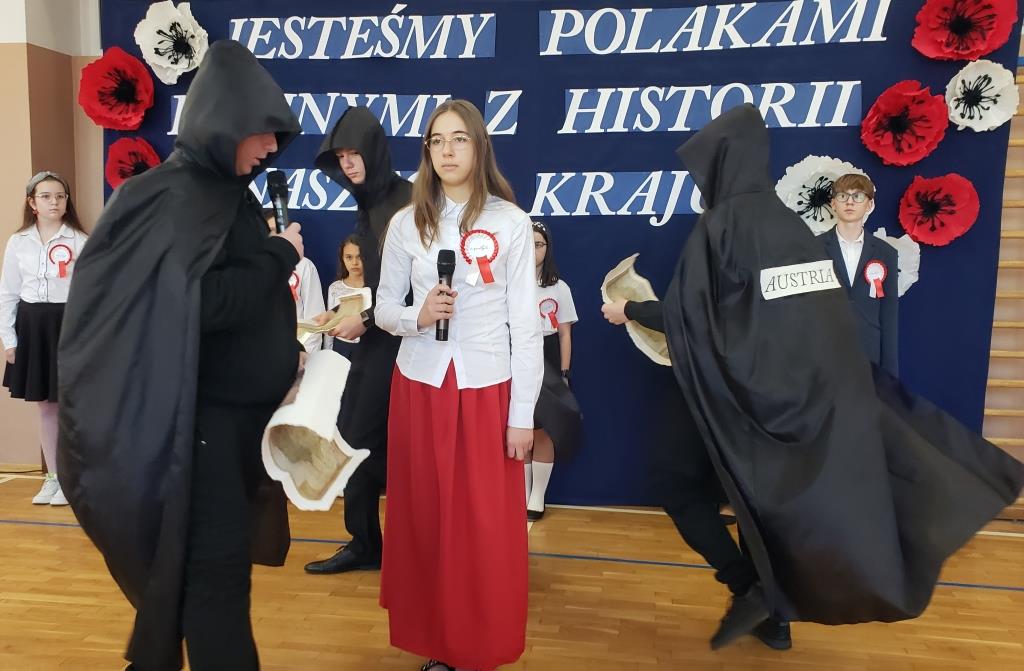 W kolejnej scenie obejrzeliśmy symbolicznie przedstawione postacie trzech zaborców: Roberta Synowca prezentującego stanowisko Rosji, Michała Maternę - Austrii i Filipa Gliwę - Prus, którzy pozbawiają Polskę – w tej roli Maria Solarska-Zaliwska – wolności (→).
