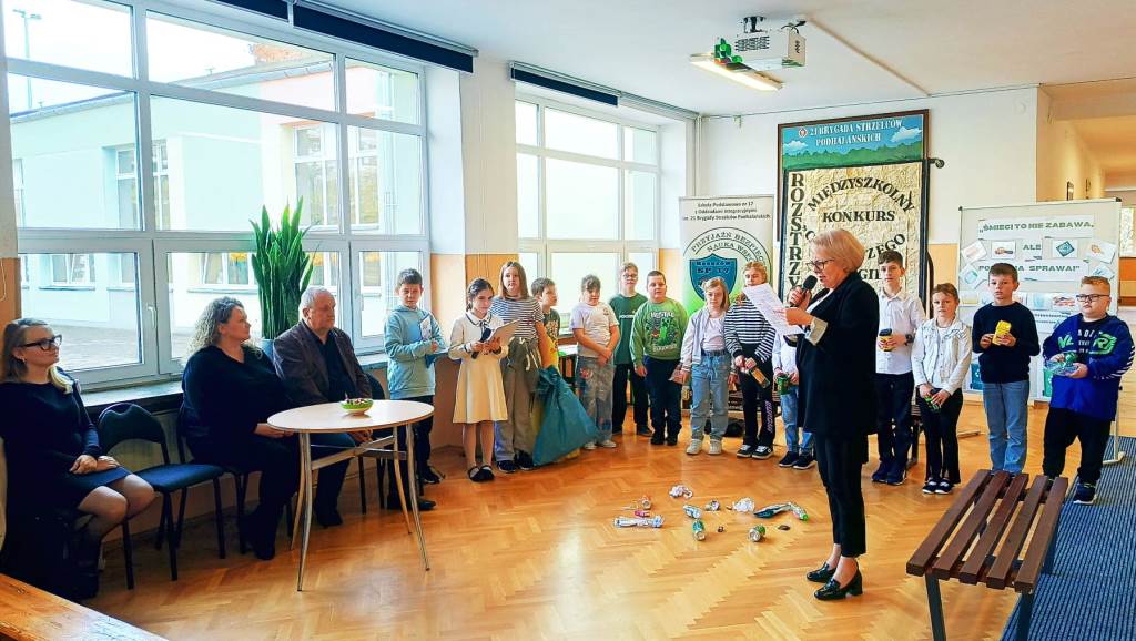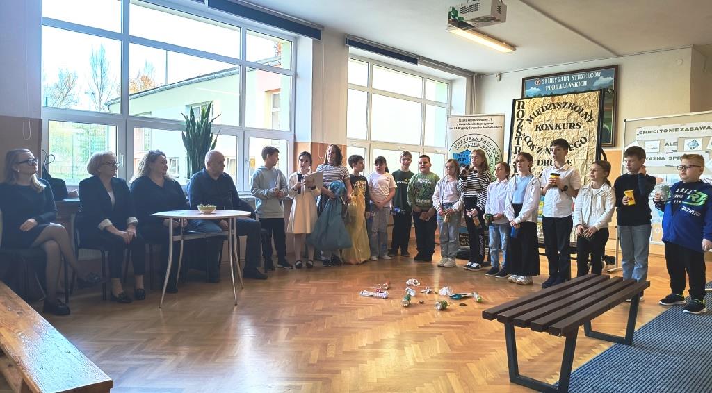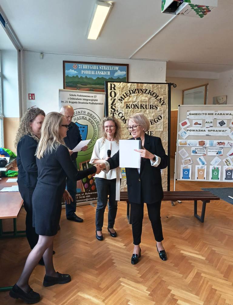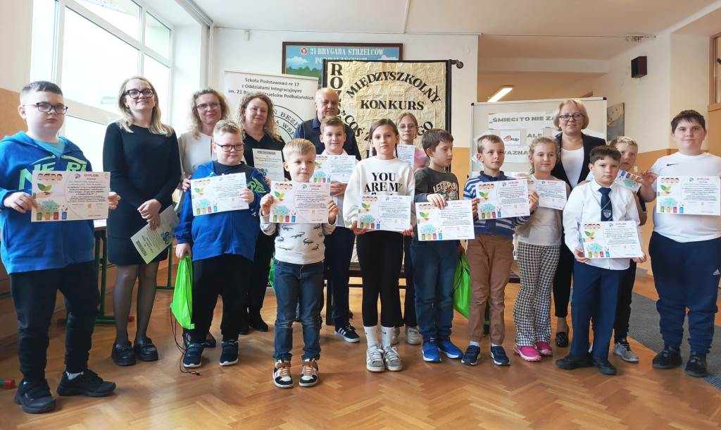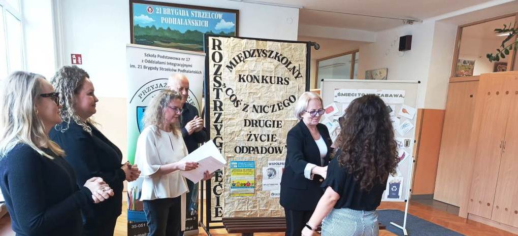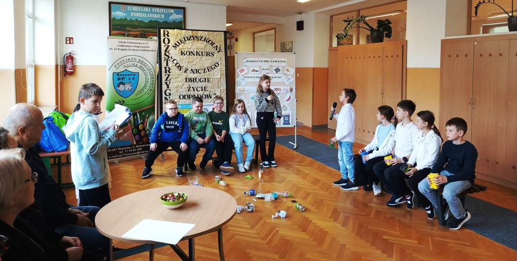 29 października 2025 r. odbyło się uroczyste rozstrzygnięcie Międzyszkolnego Konkursu Plastyczno – Technicznego „Coś z niczego – drugie życie odpadów”, w czasie którego gościliśmy przedstawicieli instytucji współpracujących przy jego organizacji, tj. Wydziału Gospodarki Komunalnej Urzędu Miasta Rzeszowa, Miejskiego Przedsiębiorstwa Gospodarki Komunalnej w Rzeszowie oraz Stowarzyszenia „Ekoskop”.