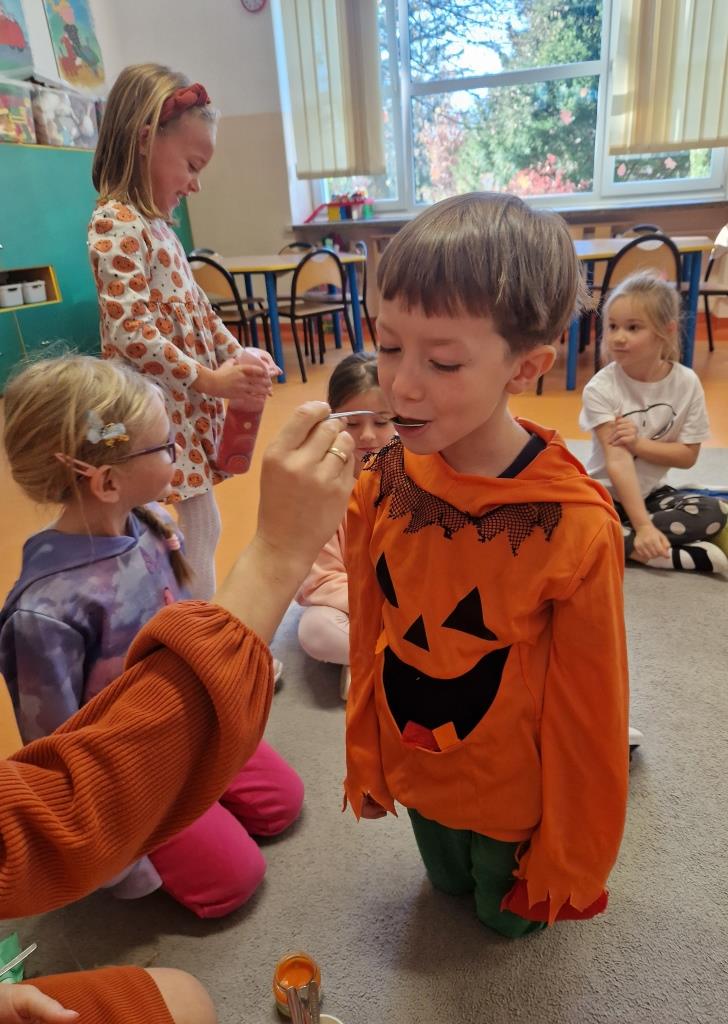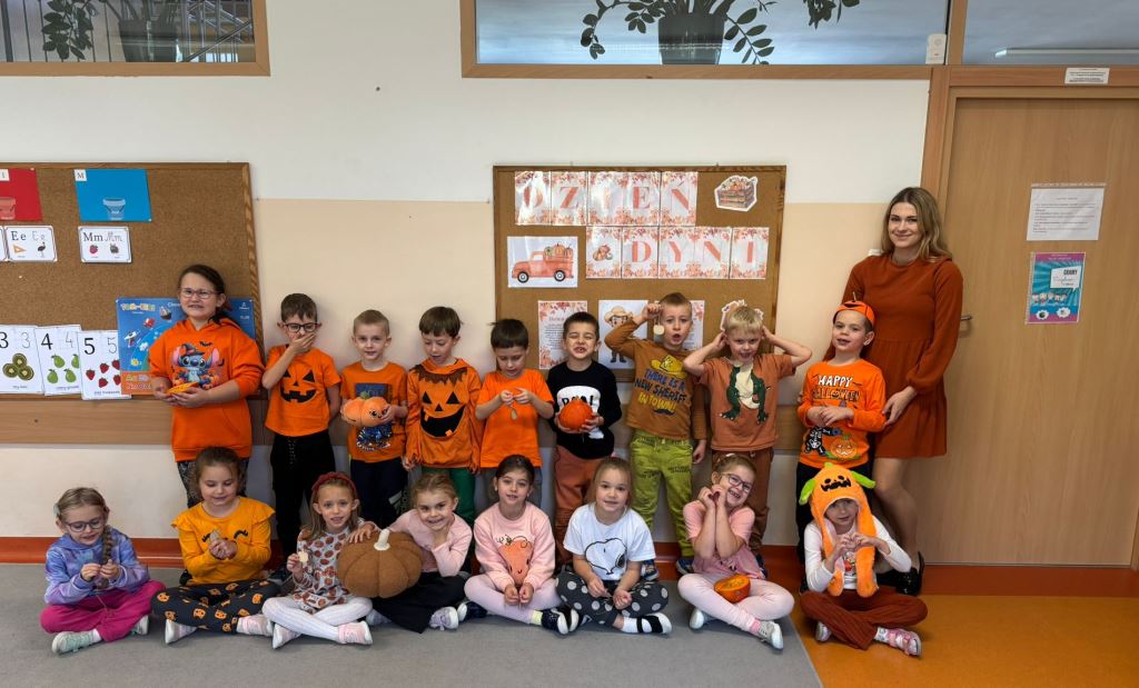 Podczas Dnia Dyni w sali królował kolor pomarańczowy. Dzieci brały udział w zabawach tematycznych i wykonały pracę plastyczną związaną z jesiennym warzywem (→foto., →foto., →foto.).